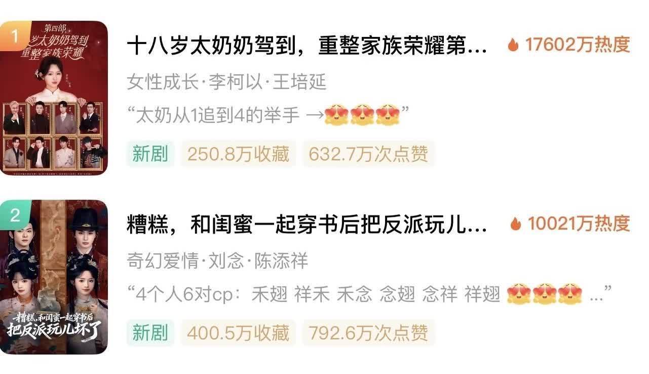 另一部《十八岁太奶奶驾到重整家族荣耀4》更是惊人,首日热度高达17062万,断层式登顶热播榜第一名,两部剧直接包揽榜单冠亚军,这般成绩让人不禁赞叹:这才是顶流应有的模样!
